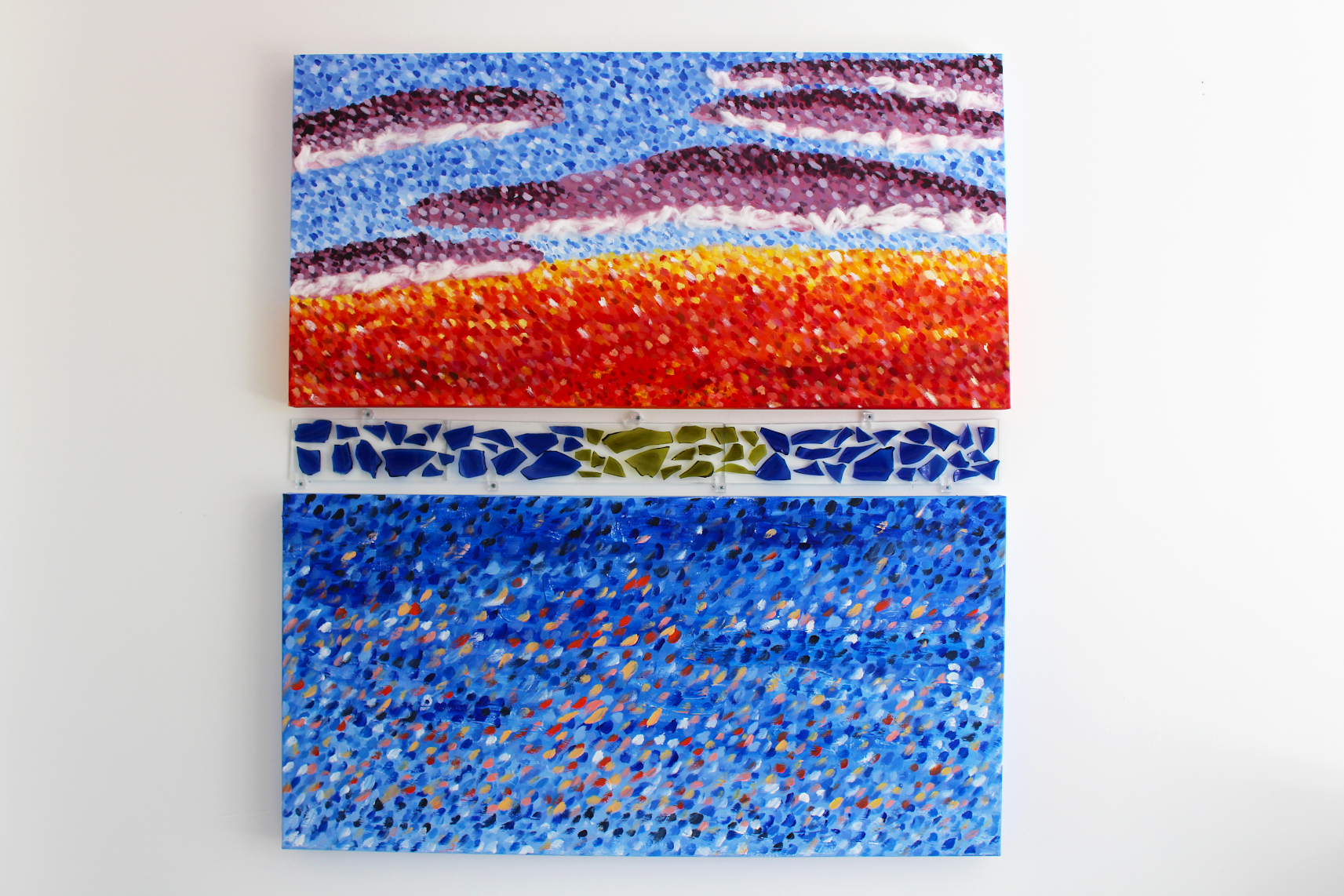 This piece was inspired by my daily evening walks to watch the sun set on the horizon over the Pacific Ocean. Living just a few blocks from the beach, I treasure the many sunsets I see and wanted to capture the beauty through a mixed medium piece featuring both acrylic paint with thousands of brush strokes, cotton balls to add texture to the clouds, and shattered glass to serve as the bridge between the sky and the water. The green represents the sliver of green many claim to see as the sun sets- I myself have yet to see this marvel of color on the horizon